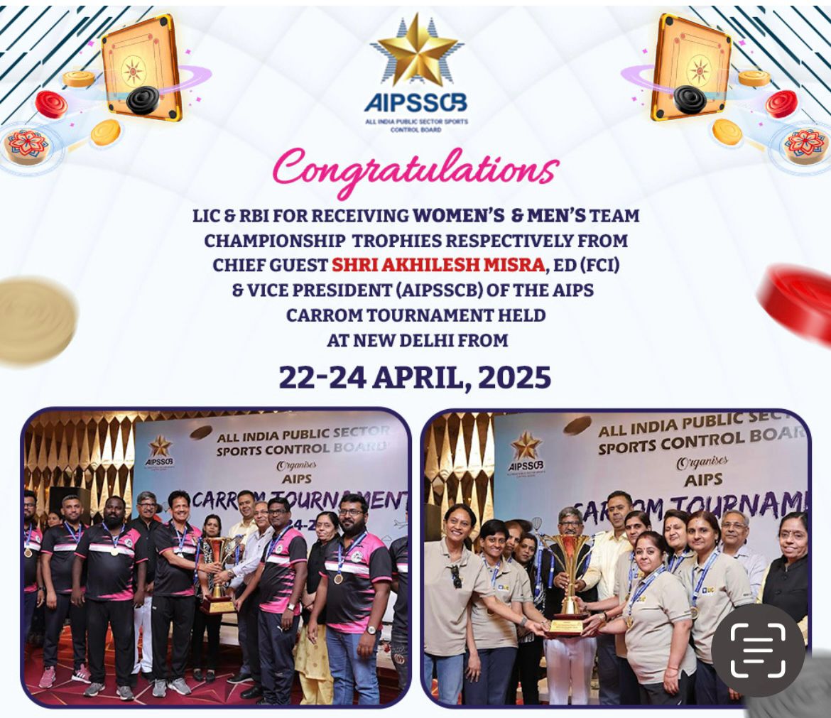 All India Public Sector Carom Tournament 2024-2025 was organized by AIPSSCB at New Delhi. The tournament was held from 22nd to 24th April, 2025 at New Delhi.