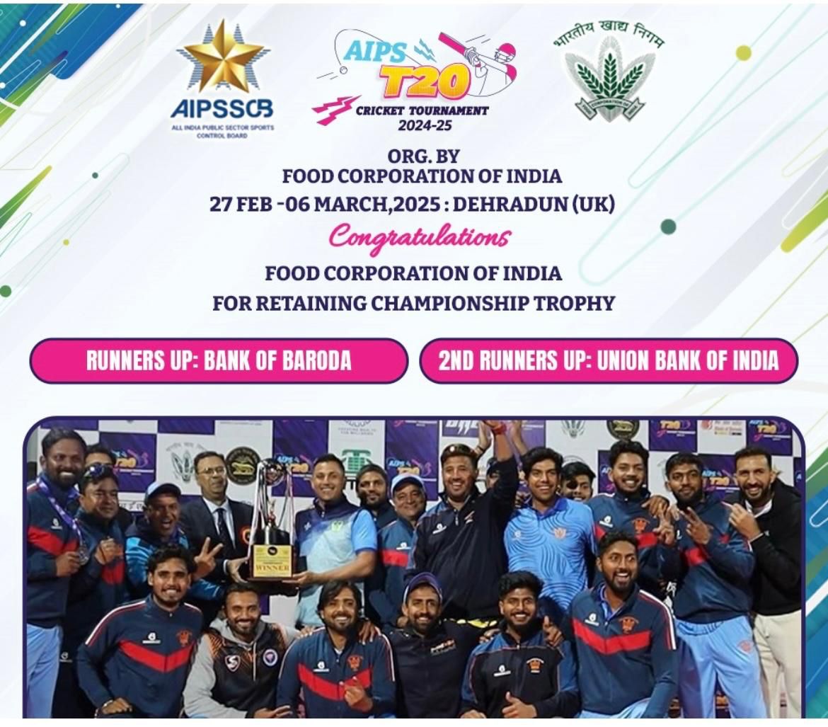All India Public Sector Cricket Tournament 2024-2025 was organized by FCI at Dehradun. The tournament was held from 27th February, 2025 to 06th March.2025 at Dehradun.